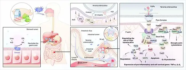 - ↑ 2.0 2.1 Shoaib, Muhammad; Shehzad, Aamir; Raza, Husnain; Niazi, Sobia; Khan, Imran Mahmood; Akhtar, Wasim; Safdar, Waseem; Wang, Zhouping (9 December 2019). "A comprehensive review on the prevalence, pathogenesis and detection of Yersinia enterocolitica". RSC Advances. 9 (70): 41010–41021. Bibcode:2019RSCAd...941010S. doi:10.1039/C9RA06988G. ISSN 2046-2069. PMC 9076465. PMID 35540058.
