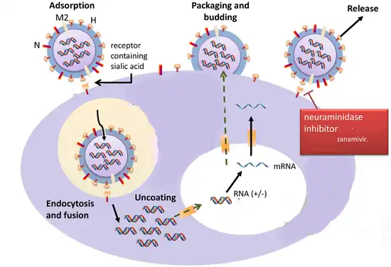 - ↑ Moscona A (September 2005). "Neuraminidase inhibitors for influenza". The New England Journal of Medicine. 353 (13): 1363–73. doi:10.1056/NEJMra050740. PMID 16192481. Archived from the original on 2021-08-29. Retrieved 2021-03-22.