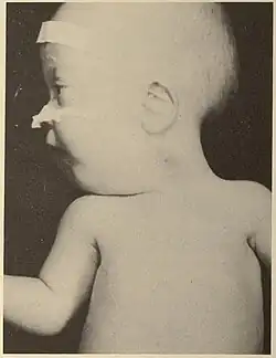 Zellweger syndrome can also affect the function of many other organ systems. Patients can show craniofacial abnormalities (such as a high forehead, hypoplastic supraorbital ridges, epicanthal folds, midface hypoplasia, and a large fontanelle), hepatomegaly (enlarged liver), chondrodysplasia punctata (punctate calcification of the cartilage in specific regions of the body), eye abnormalities, and renal cysts.[4] Newborns may present with profound hypotonia (low muscle tone), seizures, apnea, and an inability to eat.[4][7]