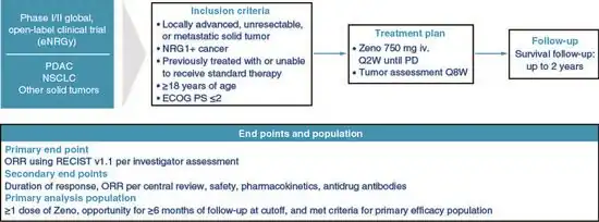 Efficacy was evaluated in the eNRGy study (NCT02912949), a multicenter, open-label, multicohort trial.[3] The trial enrolled 64 adults with advanced or metastatic neuregulin 1 gene fusion-positive non-small cell lung cancer and 30 adults with advanced or metastatic neuregulin 1 gene fusion-positive pancreatic adenocarcinoma who had disease progression following standard of care treatment.[3] Identification of positive neuregulin 1 gene fusion status was prospectively determined by next generation sequencing assays.[3]