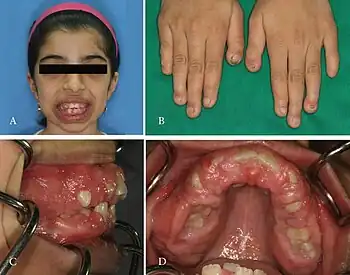 Clinical features include gingival fibromatosis, hypoplasia of the distal phalanges, nail dysplasia, joint hypermobility, and sometimes hepatosplenomegaly.[6] The nose and pinnae are usually large and poorly developed, which give individuals with the syndrome characteristic facial features. Intellectual disability may also be seen.[7][8] Gingival fibromatosis is usually present at birth or appears shortly thereafter.[2][8] Both males and females are equally affected.
