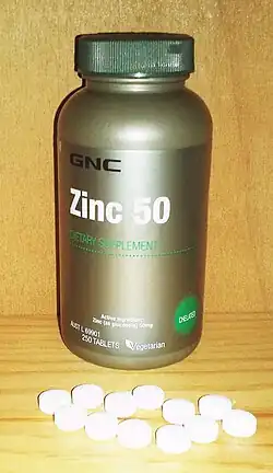 Zinc supplements (frequently zinc acetate or zinc gluconate lozenges) are a group of dietary supplements that are commonly used in an attempt to treat the common cold.[1] Evidence suggests that zinc does not prevent colds but may reduce their duration, with minimal or no impact on symptom severity.[2][3] Adverse effects with zinc supplements by mouth include bad taste and nausea.[1] The intranasal use of zinc-containing nasal sprays has been associated with the loss of the sense of smell;[1] consequently, in June 2009, the United States Food and Drug Administration (USFDA) warned consumers to stop using intranasal zinc.[1]