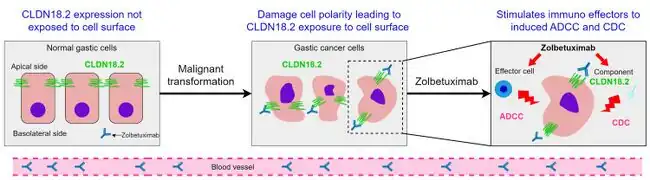 In terms of the mode of action we find that zolbetuximab binds to CLDN18.2, once bound, it triggers two immune-mediated mechanisms: first it recruits immune cells like natural killer cells to destroy the cancer cell and second it activates the complement system, leading to cell lysis.This results in the targeted destruction of CLDN18.2-positive tumor cells[13][14]