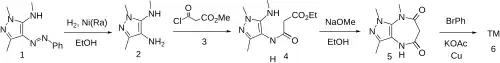 The catalytic hydrogenation of N,2,5-trimethyl-4-phenyldiazenylpyrazol-3-amine[a] (1) over Raney nickel gives 4-amino-1,3-dimethyl-5-methylaminopyrazole[b] (2). Treatment with methyl malonyl chloride[c] (3) gives 4-α-ethoxycarbonylacetylamino-1,3-dimethyl-5-methylaminopyrazole[d] (4). Base-catalyzed lactamization gives (5). The Goldberg reaction completes the synthesis of zomebazam (6).[3][4]