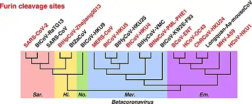 Within genus Betacoronavirus, furin cleavage sites are common in subgenera Merbecovirus and Embecovirus.[27] Furin cleavage sites have independently evolved six times in different clades of Betacoronavirus.[27] Furin cleavage sites also evolved in Alphacoronaviruses and Gammacoronaviruses independently of Betacoronavirus.[27]