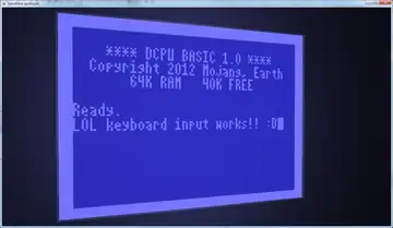 - The DCPU-16: a fully functioning emulated 16 bit CPU that could be used to control a player's entire ship, or just to play games on while waiting for a large mining operation to finish.[108] The DCPU-16 would still function while on fire, but slower and with the RAM changing randomly.[109] The ingame computers would crash if their interrupt queue was overflowed, if a specific undocumented code was called, or if the box was physically harmed. When it crashed, it would go into a state where sequential areas of ram would get overwritten with random noise, and the opcodes would take a lot longer to process. Since the monitor was memory mapped, it would blindly display this garbage data.[110] Computers would poll hardware 60 times per second, the same as the game's tick rate.[111] Computers would run at 100 khz.[112][113][114] A single ship would be able to support about three computers.[115] An open-source community-made operating system would be on the default computers.[116] Updated versions of the DCPU would be available as new computers. More efficient computers could be found in abandoned ships, such as one that does 112 khz at 94% power usage. Flying in highly radiated areas would cause random bits in a computer's ram to flip.[50] Computers could have text-to-speech software.[117][118] Computers would come with a basic bootloader for loading and running programs.[119] DCPU emulation would run on separate server threads, with multiple DCPUs per thread.[120] Multiple computers could be networked together.[121]