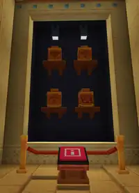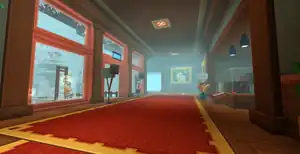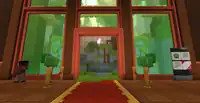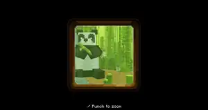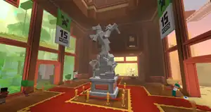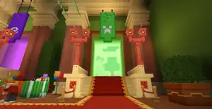 Upon starting the map, the player is greeted with a cutscene of Steve inviting Alex, Efe, and Zuri into a large garden outside the museum, before being greeted by the Party Villager. Walking forward toward the museum, the player finds many visual gags. An iron golem dressed as a security guard is circling a fountain, while a ravager is cowering on top of it, the golem seemingly annoyed by the situation. Many parrots are dancing on top of a bench and bunting, nearby several illager thieves trying to help one of theirs clime down from a rope, offering water buckets. Makena is trying to take a photo of a black cat, a witch, a warden, and a cow, telling them "everyone line up and say "Creeper", let's capture this moo-mentous moment! Give me your biggest smile and strike a pose!"