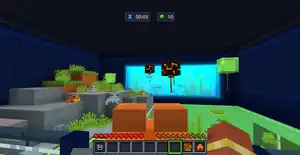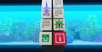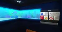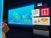 The player obtains a Camera after the entering the area, which can be used to photograph sea life and obtain their corresponding stickers. Upon getting the camera, the player can approach Steve at a banister, Alex on a bench, Noor gazing at aquatic mobs, Ari inside of a tunnel through the display near the heart of the sea exhibit, and a villager scuba diving inside of the display, near the dolphin exhibit. Inside the display itself, turtles, tropical fish, and dolphins swim around, with recreational conduits, shipwrecks, and tridents present. At the end of the hallway Ari is inside is a display of several coral blocks, with dancing glow squids and stairs to a second floor.
