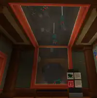 Caves and Cliffs opens with a museum of various cave-related objects, including an exhibit on the world height. Going up two sets of stairs on either end of the entrance, the player can find a second floor with portraits of a cave base, a block of diamond, an axolotl in a lush cave, and a glow squid, as well as a cardboard cutout of Steve getting knocked off a mountain by a goat. Heading forward, many more non-interactive displays are visible, including Steve fighting several monsters in a cave, Steve getting electrocuted with a lightning rod on top of a burnt village house, and several 3D goat horns. In front of the latter display is an exhibit built into the entrance to the Cave Parkour minigame, and beyond that are more exhibits, including one with an interactable Ari NPC, and two portraits of a goat with a crown and a snowy cave.
