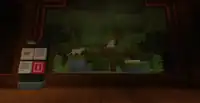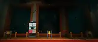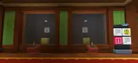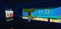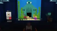 By the coral exhibit, Kai is sitting on a bench, and across from them is a marine biologist who explains coral bleaching. To the left of the biologist, Makena is at another display of fish in front of another display featuring guardians, drowned, and axolotls. Opposite to those is the Feeding Frenzy minigame, which can be initiated by a villager NPC. Down another flight of stairs, many more exhibits can be found, with Zuri admiring squids and Efe looking into the Feeding Frenzy minigame. Exiting from here returns the player to the entrance, but walking straight to the other side leads to a room with an animatronic guardian above the door.