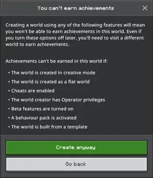 The pop up informing the player that certain settings disable achievements in the create new world screen.