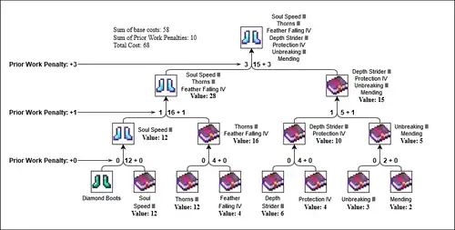 It is also possible to minimize the cost of combining by carefully pairing up the items for combination. The enchantment with the highest cost should be in the sacrifice slot the least amount of times. For example, the 7 boots enchantments can be combined using the pairing method in the following order: