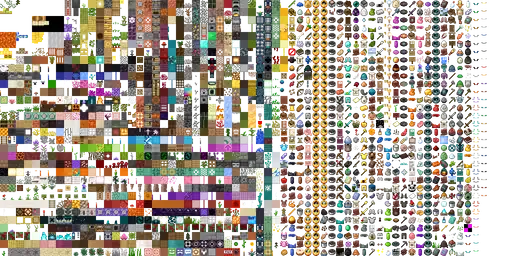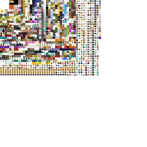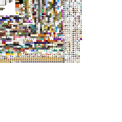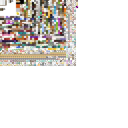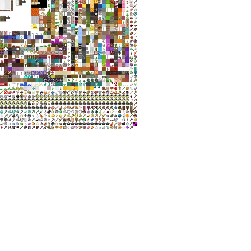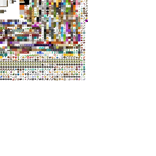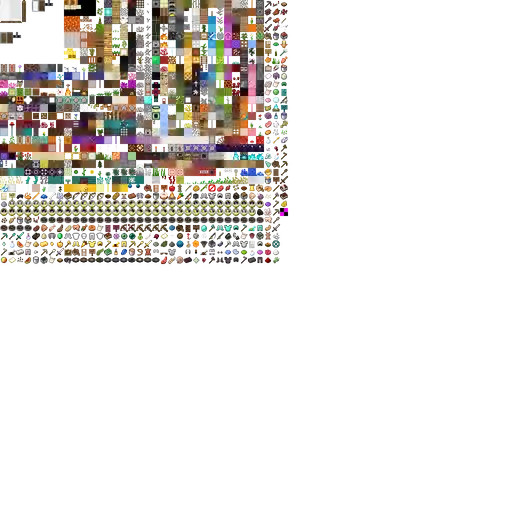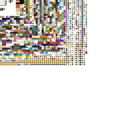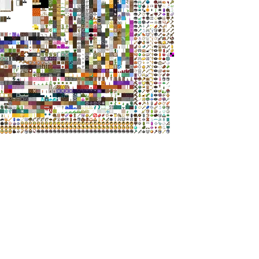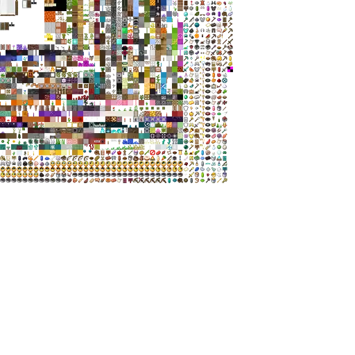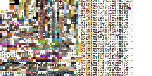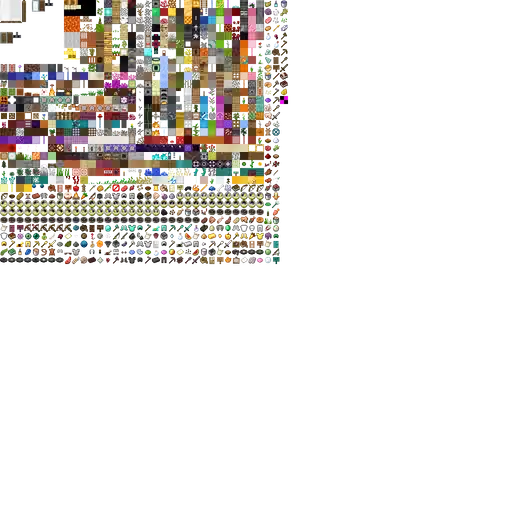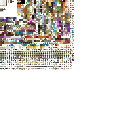blocks.png-atlas is a fixed-width 1024×512-pixel[until JE 1.21.11] or 4096×2048-pixel[upcoming JE 1.21.11] file that is split into different 16×16-pixel squares for most blocks and items. Only the top left 1024×512 corner is actually filled with blocks and items in the base game default textures.