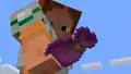 Inside the lush cave, Ari collects glow berries and raw iron, before being confronted by a zombie. Ari continues through more biomes, finding a bee nest in a meadow. Looking down at a magenta bundle, Ari collects a honey bottle from the nest without placing a campfire, angering the bees. After fleeing on a horse, Ari makes progress to a site of buried treasure, coming across an animated dolphin. Pulling out a light blue bundle, Ari feeds it salmon, before following it using a boat.