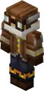 A pilot wearing a brown flight jacket with a hook on both arms, and gloves with white fur along with a white scarf, brown helmet and goggles. Its other clothes, black pants with gold trimmings resembling a happy ghast equipped with the black harness and dark brown boots. | Another simplified version of Happy Ghast Pilot Gear, made to fit the limitations of skins. Underneath the mask, there are no facial features at all. |