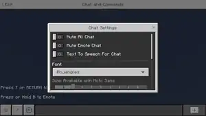 | Font | The font used in the chat window. Can be set to Mojangles or Noto Sans | Mojangles |