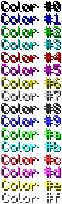 | &6 | Dark Yellow | Gold | 170 | 170 | 0 | #AA0 | 42 | 42 | 0 | #2A2A00 | |