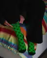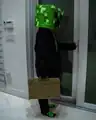 A model wearing a pin depicting a creeper. -