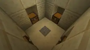 Underneath this terracotta is a secret fosse containing four chests, which are rigged by a stone pressure plate directly under the blue terracotta block. The pressure plate is connected to a 3×3 grid of TNT, which means that if a player or mob unintentionally steps on the plate, it sets off the nine TNT blocks, which destroy the chests and their loot and can kill the player. As there is no light in the chest room, mobs sometimes spawn inside it and trigger the TNT trap, destroying the chests and loot before any player can reach it.