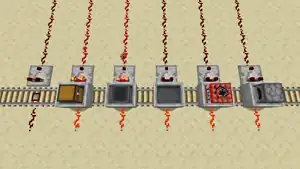 A detector rail cannot be attached to the side or bottom of any block, but attempting to make such an attachment may cause the detector rail to attach to the top of a block under the destination space. For example, if a fence is on the ground, attempting to attach a detector rail to the side of the fence causes the detector rail to be attached to the top of the ground next to the fence instead.