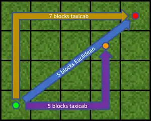 In Minecraft, the distance between two points is the measurement of how far apart the two points are. The sides of a block are considered to be 1 meter (3.28084 feet or 1250⁄381 feet) in length. Distance in the game is measured in one of three ways, Euclidean distance, taxicab distance, or Chebyshev distance, depending on whether geometric accuracy or calculation efficiency is required.
