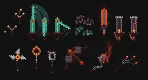 The gem scimitars are a dual-wielded melee weapon featured in concept art for the Echoing Void DLC. It had two early design iterations.