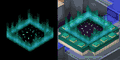 The end portal consist of twelve end portal frames with staircases leading up to it on both sides along with a pool of lava underneath. There are already six Eyes of Ender in the portal. The hero has to obtain the other six by defeating the six eyesent. once all the frames are filled in the portal will activate and will have a glowing blue aura.