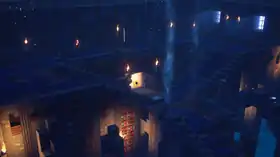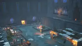 Lone Fortress is a large frostbitten castle located north of Frosted Fjord. It is composed of long hallways, open outdoor sections, and thin paths set atop the battlements of the fortress. It features decorated blue carpet, statues of enchanters and horses, torches, wooden catapults, lilypads, blue stained glass windows, frozen water pools and waterfalls, bookcases, chandeliers, and paintings of the Arch-Illager with "weak" and "foe" graffitied on them. Upon entering the first indoor portion of the mission, a blue locked gateway can be found up a set of stairs that must be unlocked using a diamond key golem located on one of the long paths to the sides. The diamond key golem can either be in an area with a chasm filled with skeletons perched on stone pillars, or it can instead be in an elevated library locked behind several gates lowered by activating buttons and defeating ambushes. After opening the blue locked gateway, a tall spiral staircase must be climbed to reach a ruined bridge that has become completely frozen by the extreme cold. Near the end of the mission, two locked gateways, one blue and one yellow, can be found in an open indoor area of the fortress. By navigating around the center section to the west side and following the path down, the center section containing a diamond key golem can be reached. Upon defeating an ambush, the heroes can escape the center section and return the diamond key golem to the blue locked gate, granting access to several emerald urns and creating a pathway to the gold key golem. Upon opening the yellow locked gate using the gold key golem, the frozen arena containing the Wretched Wraith, along with statues of royal guards on the walls, can be reached. Upon defeating the Wretched Wraith, the gate to the north-east will be lowered, granting access to an elevated area with a toppled blue throne, green torches, and statues depicting a hero defeating a dragon. It is here that the exit of the fortress can be found which, if entered, ends the mission.