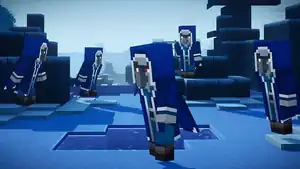 Most of the unfriendly inhabitants of this frostbitten land eke out a meagre existence, but a few have acquired great power through magical means. Enchanters use ancient knowledge to strengthen their allies, evokers summon aggressive otherworldly beings, geomancers wield the might of nature, while illusioners clone themselves to confuse their opponents. But perhaps the most sinister of all are those illagers who tap into the power of the cold itself, and attempt to entrap their foes beneath an avalanche of snow and ice. These dangerous and powerful enemies are called iceologers, and they're our mob of the month. Unlike their illager siblings, iceologers can be easily recognized by their long blue cloak with a hood and cape. This cloak, combined with their grey skin and lighter blue underclithes allow them to easily blend into the frosty landscape. But watch for their bright red eyes, which burn with a fire that you might not expect from such a worshipper of the cold. If one sees you, you'll want to move fast. Cast your eyes toward the heavens and you'll see an enormous chunk of snow and ice forming above your head. If it lands on you, you'll be stunned for several seconds and then subsequently chilled for another few seconds as your body slowly returns to normal temperature. Luckily, iceologers are not the most resilient of the illagers. Their robes allow great freedom of movement for spellcasting, but offer little protection from an arrow, or the swing of a hammer or sword. Smart players will either close the distance fast between them and the iceologer, or take them down with a hail of arrows from range. Either way, consider them a priority target. You'll inevitably encounter many of these chilly spellcasters as you battle to free the land of its icy curse. But if you keep your wits about you, act quickly and take out any iceologer you see before it can complete its summoning spell, then you might just survive their onslaught. This wintery kingdom needs you - we hope that you can prevail." |