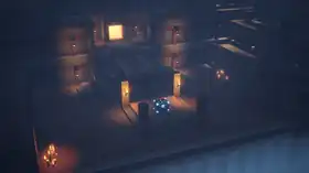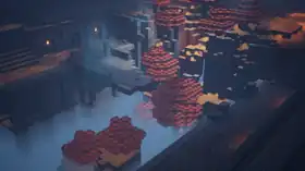 Pumpkin Pastures is a vast expanse of autumnal farmlands and villages that have been ravaged by the Arch-Illager's army, with the villagers of the pastures having been captured and caravanned elsewhere. It features burning village houses, pumpkins, lakes, ruins, bridges, windmills, and farms. Near the start of the mission, a large ship can be found that contains the entrance door of Mystery Ship. Mystery Ship contains the captured mystery merchant, as well as a scroll left behind by a navigator from Pumpkin Pastures.[1] Halfway through the mission, to the north-east atop the stone brick battlement a button near some crates can be activated to reveal the entrance door of Pumpkin Pastures Rune Room[note 1]. In an area found shortly afterwards, a drawbridge must be lowered using two levers, leading to a supplies chest and granting access further into the mission. At the end of the mission, a village bell can be found in the center of a village that, if rung, alerts the Arch-Illager who summons an ambush of illagers. Upon defeating the ambush, the town hall building can be reached to the north-east which, if entered, ends the mission.