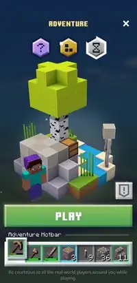 Tapping on the hotbar let the player choose which items from the inventory were to be available in the hotbar when the adventure began. Any items placed here were lost if the player was killed during the adventure. A player was expected to have crafted the proper tools before entering an adventure. A pickaxe was needed for mining some stone blocks (a stone pickaxe was required for harvesting iron ore), a sword was useful for attacking hostile mobs, and an axe was most efficient for breaking wood items. Food was needed to restore health during an adventure if attacked by mobs.