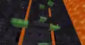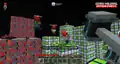 More platforms and pipe sequences occur, until the player must take another push towards a ladder. However, due to the presence of a pipe above, the way to reach it is instead to run off the edge and grip onto the platform below, up to another conveyor belt. From there a series of red platforms curve around to a final pipe, before reaching the top of the engine, which upon completion unlocks the “Engineer” sticker. Players can jump off the Redstone Engine’s top onto a large slime block platform.