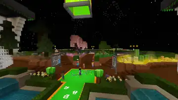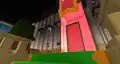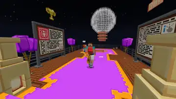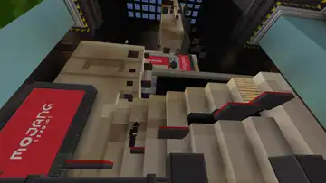 The lobby’s right houses a large parkour track, themed around video game consoles. The track begins by platforming across several red platforms across from what appears to be a smartphone or tablet, before arriving at two sets of ladders, leading to a laptop and confetti cannon. Inside the laptop are stone stair keys, as opposed to functional ones used elsewhere, with a track-pad made of polished andesite. The track continues into a PC resembling quartz bricks, with several more red platforms before transitioning to platforming across internal components. If the player falls at any point, they can climb a ladder to return to the start of the area.