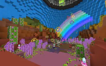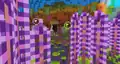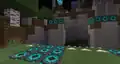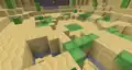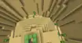 There are two Biome Domes players can visit containing fictional biomes, To the right, between the jungle and the desert, is a cyan biome where nearly everything is made out of diamonds. The trees resemble oak, pale oak, and spruce, but with dark oak logs and diamond cyan leaves. Closest to the entrance is one adorned with diamond cave vines and diamond resin clumps, with diamond eyeblossoms and diamond ore scattered throughout. While exploring the dome, diamond snow will fall from the top of the dome. Traveling across a fallen tree bridge over a river, players can find a small research station, with a scientist NPC standing on a dirt block amongst the cyan grass. Nearby is a small cave made of coarse dirt, with a coin inside. At the end of the lake is an ordinary spruce.
