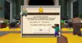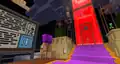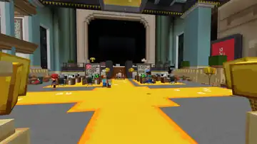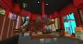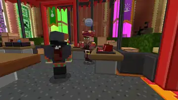 In the center of the Lobby is the shop, where players can buy items from one of two vendors. Entering through the front of the Lobby, players can eye lab coats and office passes to the left and right, the first vendor on the right. The opposing vendor is on the left side, in front of dev hats, with a rack of boosts in boxes to their right, reminiscent of vinyl albums or comic books. In the center are mystery potions and eerie soup, with scattered boxes all throughout the shop. A massive cubic replica of the Earth hovers above the shop, with faces of Steve and Alex repeatedly appearing at certain locations.