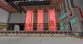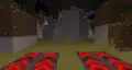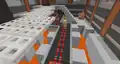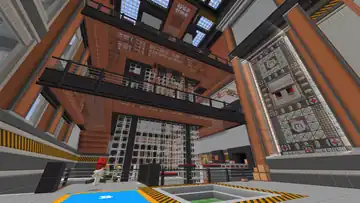 Directly in front of the players visiting the Mob Factory is the Redstone Engine parkour course, which begins by leaping onto several floating red platforms, onto a conveyor belt delivering boxes. Jumping across several pipes leads to some more red platforms, before the player reaches a catwalk. After going up a flight of cut copper stairs, the player reaches another conveyor belt, and must cross more red platforms, onto higher pipes.