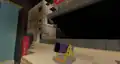 Between the exit and entrance to the minigame is a second spawn point, where players will enter the server after all log-ins following the cold open. On the wall behind them is an array of giant clocks, showing various time zones, above a confetti cannon, several tables, many large cardboard boxes, and a cardboard cutout of Agnes and a creaking.