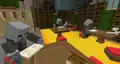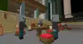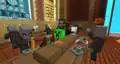 Upon entering the Lobby for the first time, players can speak with Jens and Agnes, who explain the situation. Somehow, the release of the Garden Awakens has unleashed chaos across the studio, Jens tasking players with going to each of the four departments to solve their problems through minigames. Behind him and Agnes are a row of computers with stools and lamps themed after skulls and creeper heads, while in front of them to the side are large boards that can show the daily challenges and "office notes" when interacted with. Beside the signs, and across the left and right sides of the room, are several vindicator employees working various jobs. Closest to the office notes are cartographers with maps, alchemists with brewing stands, and documentarians rearranging a thin bookshelf. Closest to the daily challenges are armorers, with a chicken running back and forth with a gold helmet, sewers sheering a white sheep and juggling wool, and a long table with three vindicators ringing a bell. Behind the bell vindicators is a large gaping hole, infested with pale moss, several creakings peering from the darkness.