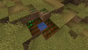While a village farm is a good ready-made source of food, a village is not required for farming crops. A player with access to water, dirt or grass blocks, and a hoe may create a farm anywhere.