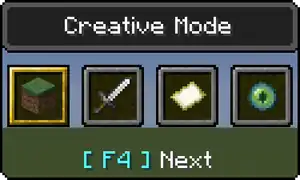 The game mode switcher is activated on a combination of debug hotkey, when F3 is held down and F4 is then pressed. The game mode choice can be made by pressing F4 repeatedly until the game mode of choice is outlined. When F3 is released, that game mode is selected and applied to the player. The game mode options are, in order, Creative, Survival, Adventure, and Spectator. The game mode initially selected when the screen is opened is whatever game mode the player was last in. Before the game mode has been changed at all, the default selection is Creative if currently in any other game mode or Survival if currently in Creative mode.