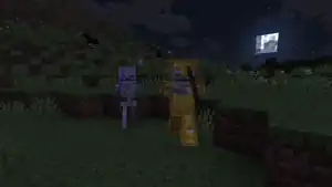 - ↑ 2⁄3 chance of an iron shovel, 1⁄3[until Mounts of Mayhem] or 1⁄6[upcoming Mounts of Mayhem] chance of an iron sword, 1⁄6 chance of an iron spear[upcoming Mounts of Mayhem][check the code]