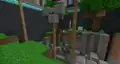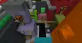 In this minigame, teams must knock several zombies into a pit, using either slime blocks or snowballs. To get snowballs, they can stand on a pressure plate and gradually build up several stacks. To use slime blocks, there is a row of pressure plates in front of a window, which activate pistons and knock the zombies.