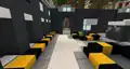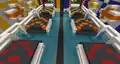 The lobby is split into four main sections, each being a course where players can be on either the yellow team or blue team. While a game is in session, any non-participating players can go down a flight of stairs and watch the progress from extensive viewing booths next to the games. Upon starting, only the iron course is open, but a handful of other venues are available. Approaching the iron course, the player can see a promotion for Grid Runners Pro, a sequel to the map with new features, and on the right is a diagonal staircase leading up to a costume shop, where the player can select costumes and wear uniforms. Similarly, sandwiched between the diamond and emerald courses is a car shop, where players can ride cars similar to horses.