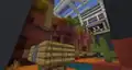 Around the gold course, the player can find two paths of sorts. To the left is a staircase leading to a food court, with acacia stairs for chairs and a stand full of cake. To the right of the course is a diving board, which the player can jump off into a tube into a lower area of the lobby, where their fall is broken by water. Dropping down to this area reveals it to be a pond, with a wooden bridge behind a quartz bridge, which leads to several long staircases leading upward and downward. Traveling down, the player finds a small patch of grass with artificial trees, before reaching an artificial lake with tropical fish swimming, an oak plank dock, a T. Rex fossil made out of sandstone and what appears to be a generator. If the player wishes to leave, there are several fan structures, identifiable by yellow carpets, which propels the player upward. Alternatively, the player can advance up the stairway, emerging from doors between the courses.
