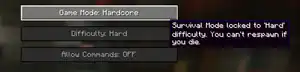 When creating a Hardcore mode world, the Allow Commands, Starting Map,[Bedrock Edition only] and Bonus Chest world options are locked and disabled. On the world selection menu, Hardcore mode worlds display dark red text reading "Hardcore Mode!"