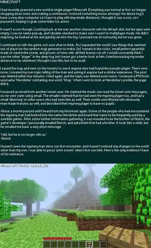 At some point before August 19,[8] a similar altered version of the story surfaced: "White Eyes" gained the name "Herobrine," and was now described as the deceased brother of Notch (in reality, Notch has never had a brother[9]), taking the form of a player entity with white eyes. The exact origin of this version of the story is unknown, with the earliest known instances of it being from a blog post from August 22, 2010,[10] a comment in a Minecraft Forum thread on August 30,[11] and a now-deleted image posted on 4chan's paranormal /x/ board on August 31.[12]