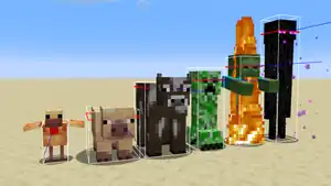 Several entities with different bounding box sizes next to each other. From left to right, the shortest to tallest: chicken, pig, cow, creeper, zombie, and enderman.