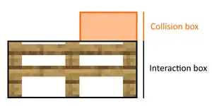 While most blocks have their collision box identical to their interaction box, some may have different collision box compared to their interaction box counterpart. For instances, the lecterns' collision box do not extend into the upper part of their interaction box, and the fences' collision box are a bit taller than their interaction box.