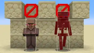 A wither skeleton has a taller eye height hitbox (red) than a villager, making it suffocate in the barrier block above it.
