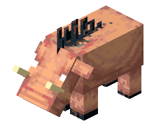 A hoglin is a breedable hostile mob found in the Nether, and a source of porkchops and leather. Hoglins are repelled by warped fungi that is placed in the world as well as active Nether portals and respawn anchors. It attacks by thrusting its tusks upward, which can also launch its target a short distance into the air.